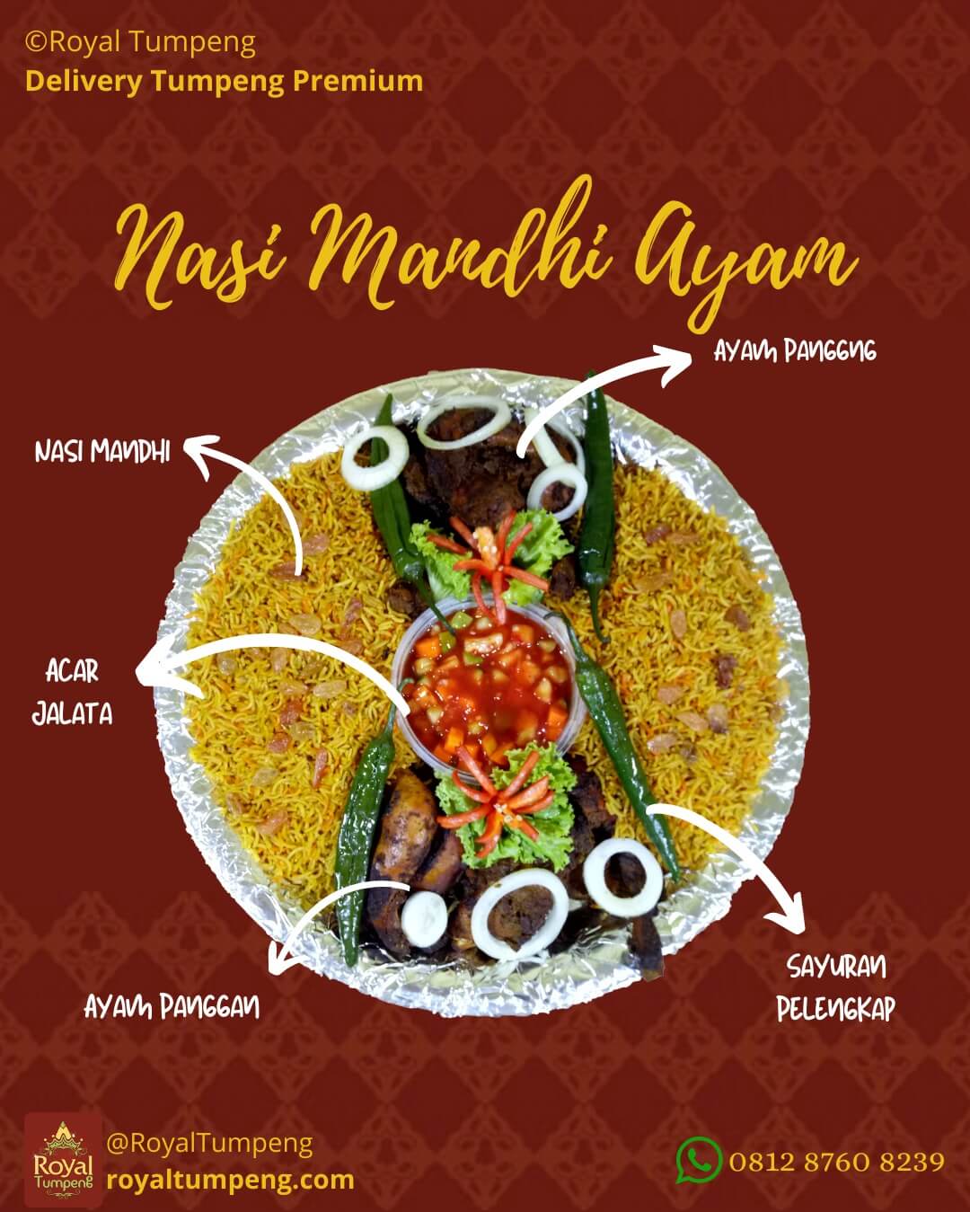 Saat ini catering Royal Tumpeng menyediakan Nasi Kebuli Mandhi enak yang disajikan di atas nampan. Anda bisa memilih Kebuli Mandhi dengan daging ayam atau daging kambing. Kelebihan nasi kami yaitu: