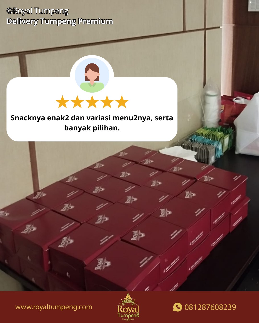 Pelanggan kami pun biasanya memesan snack box untuk acara kantor seperti family gathering, meeting, dll. Anda bisa memilih sendiri menu untuk snack box tersebut seperti soes cokelat, soes vanilla, risoles ragout, kroket, lumpia basah, atau kue lainnya yang bisa dinikmati banyak orang. Selain harganya terjangkau, menu yang bervariasi menjadi alasan mengapa snack box selalu menjadi pilihan pertama pada acara kantor tersebut.