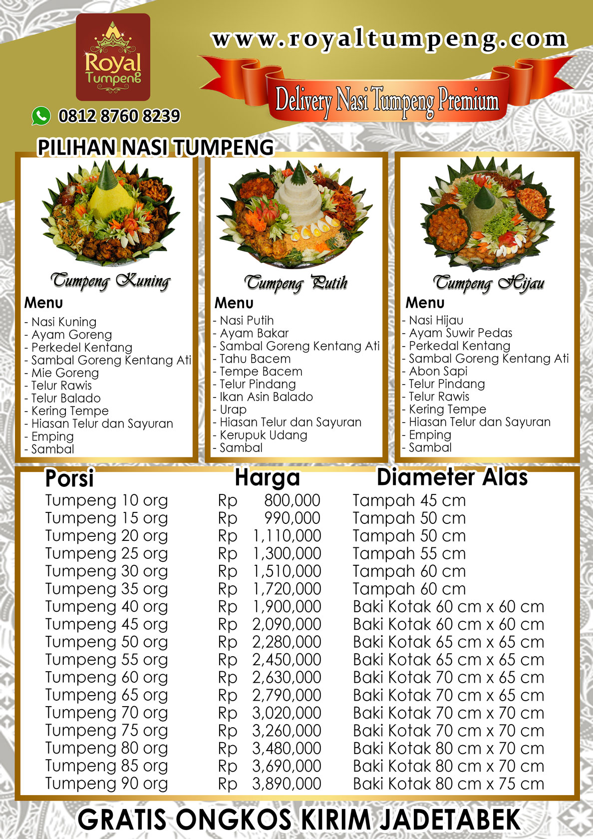 - Bisa menggunakan ornamen sendiri dikirimkan ke kantor Royal Tumpeng (sudah diterima Royal Tumpeng H-1)